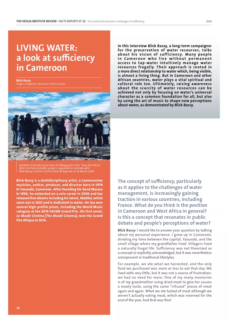 In this interview Blick Bassy, a long-term campaigner for the preser vation of water resources, talks about his vision of sufficiency. Many people in Cameroon who live without permanent access to tap-water intuitively manage water resources frugally. Their approach is rooted in a more direct relationship to water which, being visible, is almost a living thing. But in Cameroon and other African countries, water plays a vital spiritual and cultural role too. Ultimately, raising awareness about the scarcity of water resources can be achieved not only by focusing on water’s universal character as a common foundation for all, but also by using the art of music to shape new perceptions about water, as demonstrated by Blick Bassy.