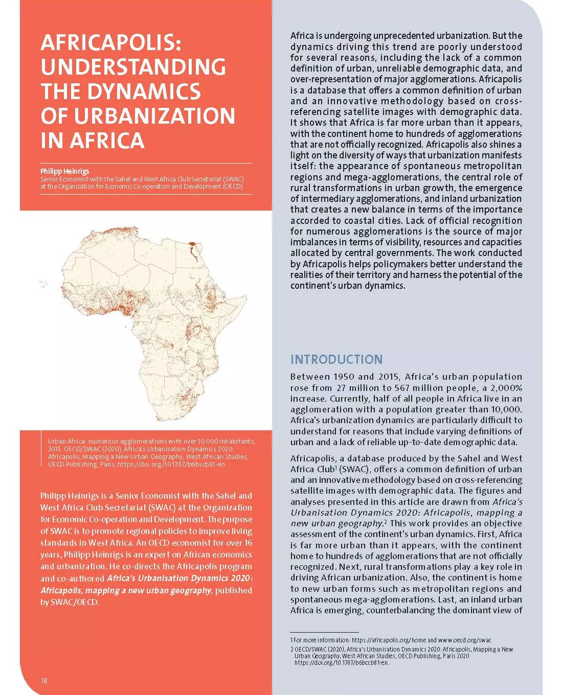 Africa is undergoing unprecedented urbanization. But the dynamics driving this trend are poorly understood for several reasons, including the lack of a common definition of urban, unreliable demographic data, and over-representation of major agglomerations. Africapolis is a database that off ers a common defi nition of urban and an innovative methodology based on crossreferencing satellite images with demographic data.