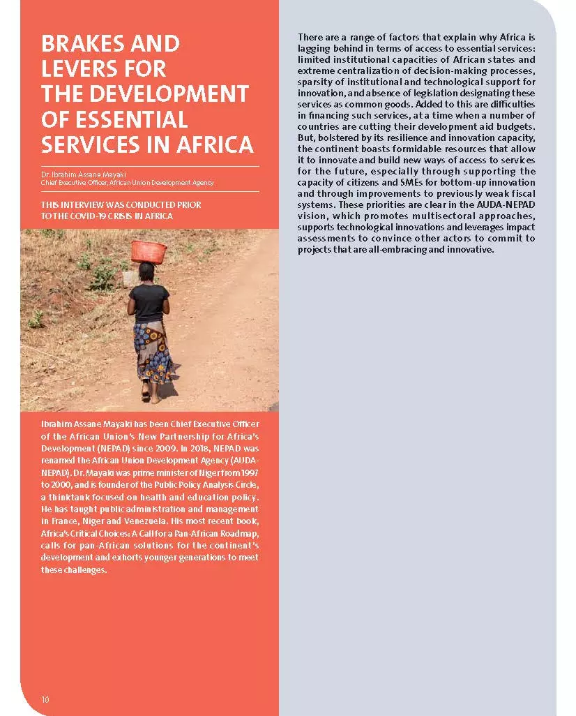 But, bolstered by its resilience and innovation capacity, the continent boasts formidable resources that allow it to innovate and build new ways of access to services for the future, especially through supporting the capacity of citizens and SMEs for bottom-up innovation and through improvements to previously weak fiscal systems. These priorities are clear in the AUDA-NEPAD vision, which promotes multisectoral approaches, supports technological innovations and leverages impact assessments to convince other actors to commit to projects that are all-embracing and innovative.