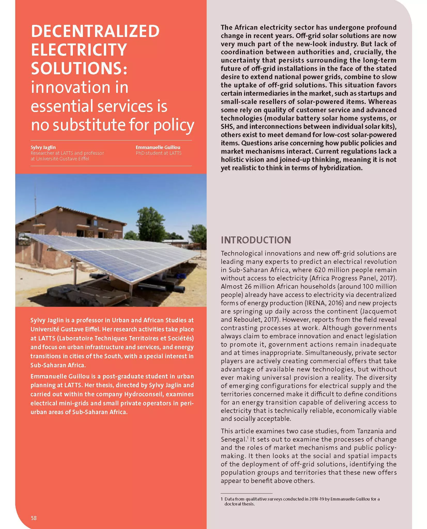 The African electricity sector has undergone profound change in recent years. Off -grid solar solutions are now very much part of the new-look industry. But lack of coordination between authorities and, crucially, the uncertainty that persists surrounding the long-term future of off -grid installations in the face of the stated desire to extend national power grids, combine to slow the uptake of off-grid solutions. This situation favors certain intermediaries in the market, such as startups and small-scale resellers of solar-powered items.