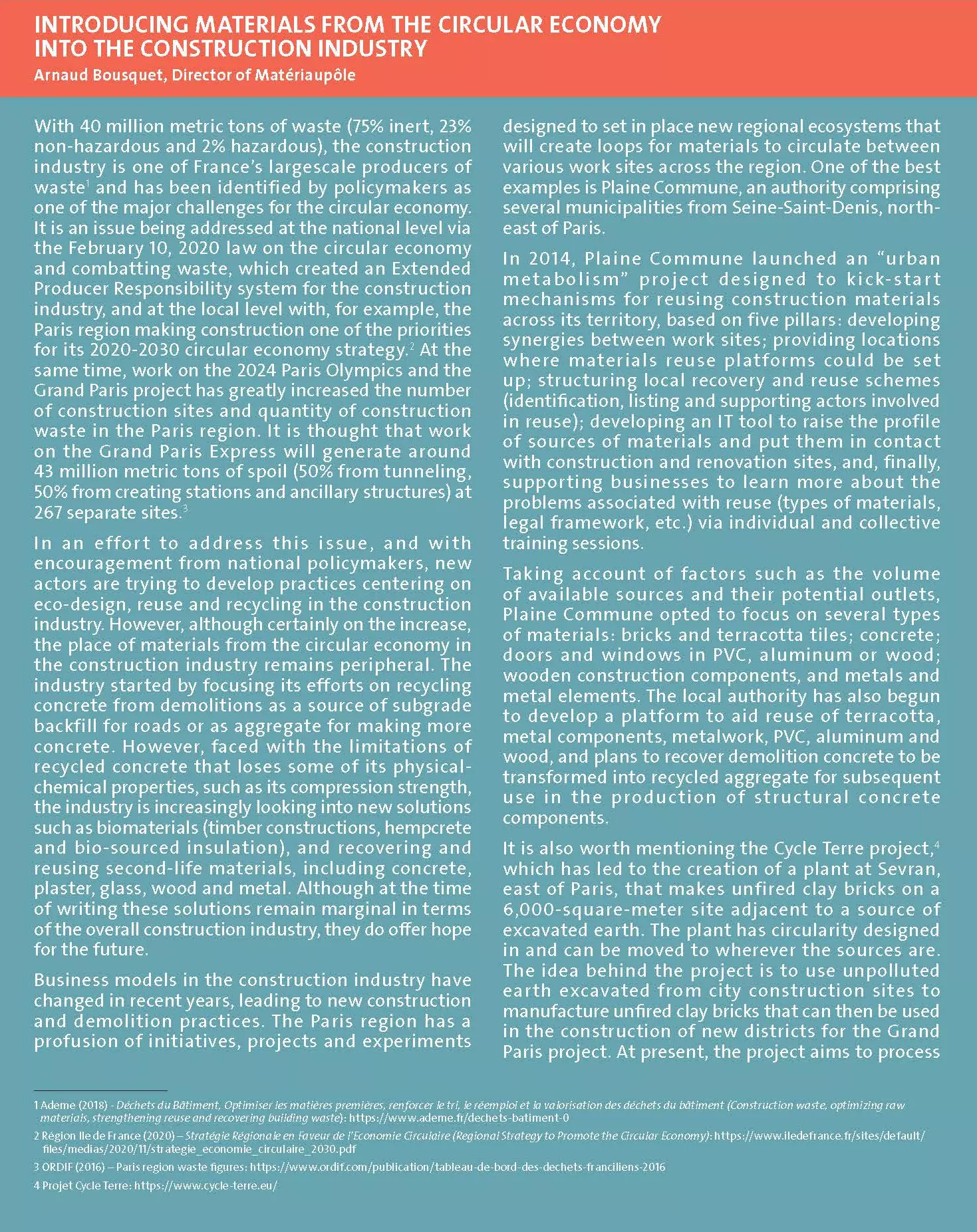 2 Région Ile de France (2020) – Stratégie Régionale en Faveur de l’Economie Circulaire (Regional Strategy to Promote the Circular Economy): https://www.iledefrance.fr/sites/default/files/medias/2020/11/strategie_economie_circulaire_2030.pdf