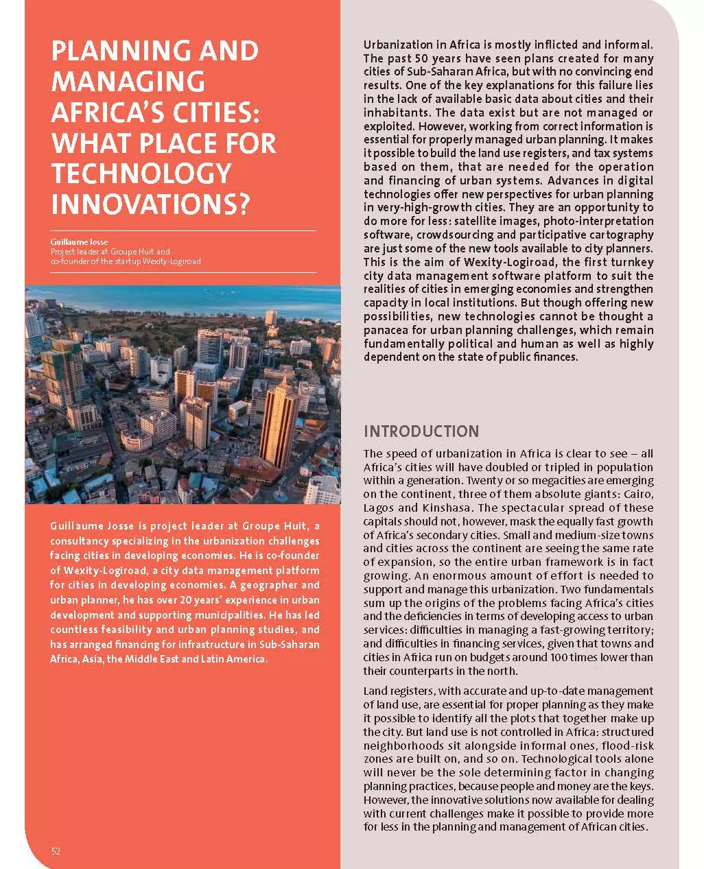 Urbanization in Africa is mostly inflicted and informal. The past 50 years have seen plans created for many cities of Sub-Saharan Africa, but with no convincing end results. One of the key explanations for this failure lies in the lack of available basic data about cities and their inhabitants. The data exist but are not managed or exploited. However, working from correct information is essential for properly managed urban planning. It makes it possible to build the land use registers, and tax systems based on them, that are needed for the operation and financing of urban systems. Advances in digital technologies offer new perspectives for urban planning in very-high-growth cities. They are an opportunity to do more for less: satellite images, photo-interpretation software, crowdsourcing and participative cartography are just some of the new tools available to city planners.