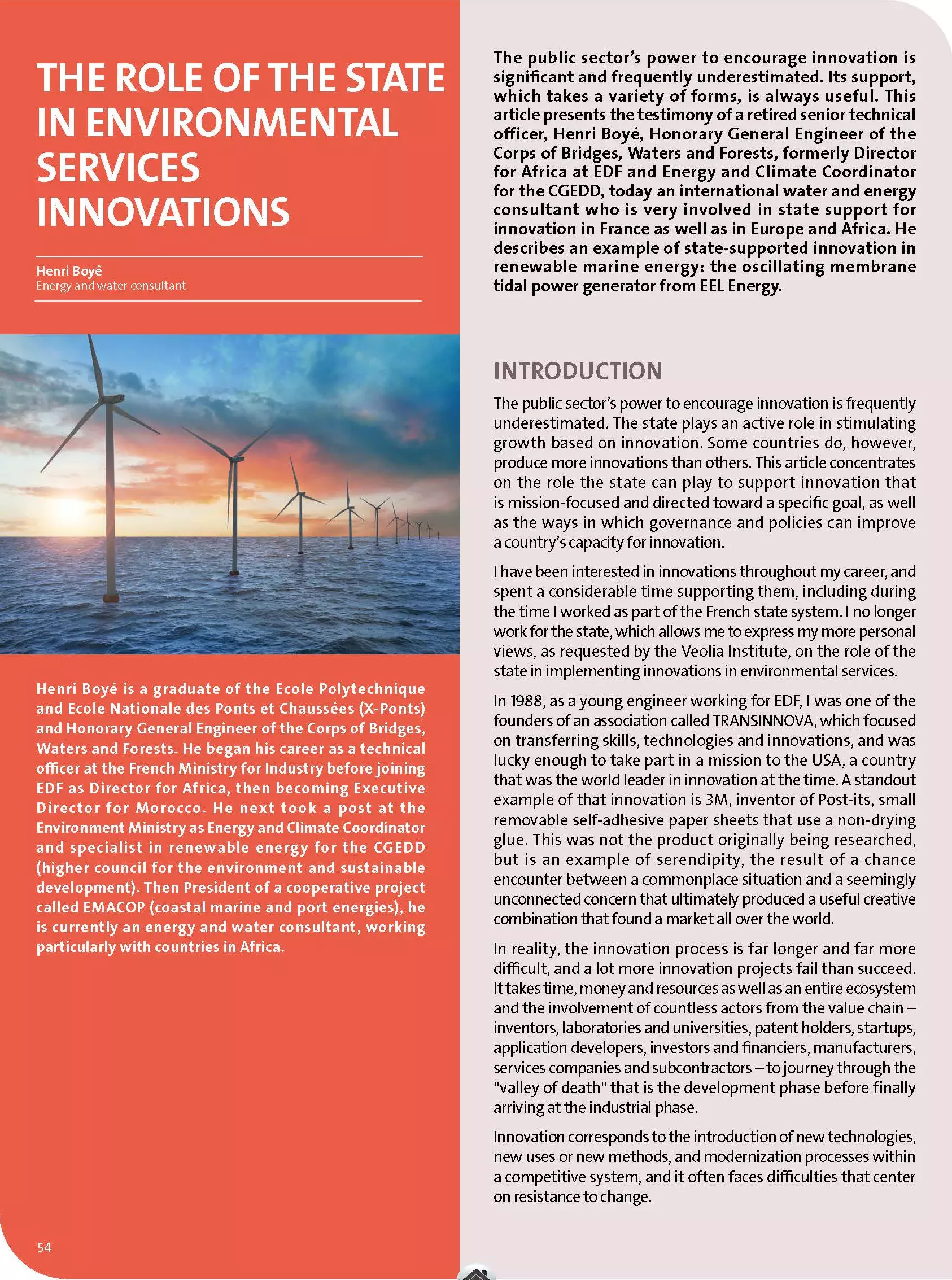 The public sector’s power to encourage innovation is significant and frequently underestimated. Its support, which takes a variety of forms, is always useful. This article presents the testimony of a retired senior technical officer, Henri Boyé, Honorary General Engineer of the Corps of Bridges, Waters and Forests, formerly Director for Africa at EDF and Energy and Climate Coordinator for the CGEDD, today an international water and energy consultant who is very involved in state support for innovation in France as well as in Europe and Africa. He describes an example of state-supported innovation in renewable marine energy: the oscillating membrane tidal power generator from EEL Energy.