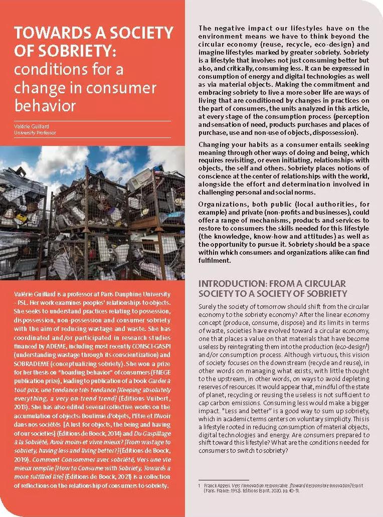 The negative impact our lifestyles have on the environment means we have to think beyond the circular economy (reuse, recycle, eco-design) and imagine lifestyles marked by greater sobriety. Sobriety is a lifestyle that involves not just consuming better but also, and critically, consuming less. It can be expressed in consumption of energy and digital technologies as well as via material objects. Making the commitment and embracing sobriety to live a more sober life are ways of living that are conditioned by changes in practices on the part of consumers, the units analyzed in this article, at every stage of the consumption process (perception and sensation of need, products purchases and places of purchase, use and non-use of objects, dispossession).