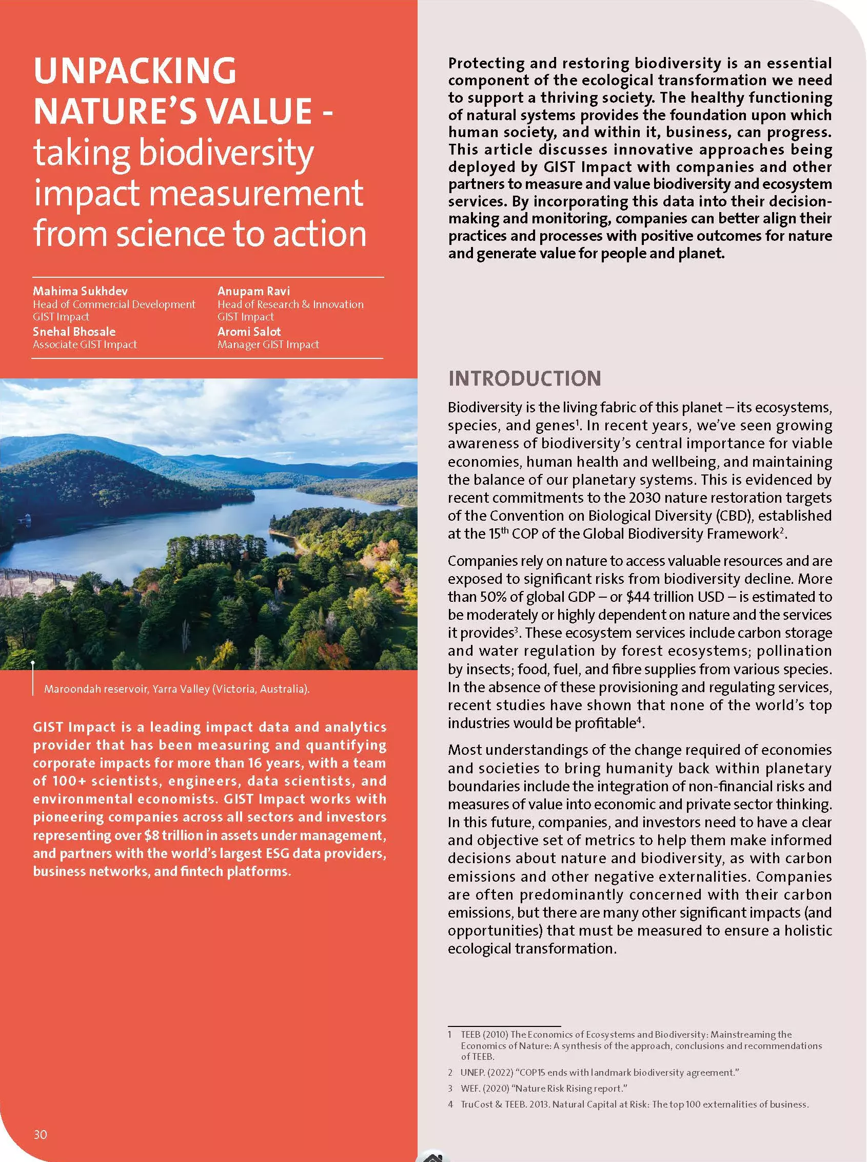 This article discusses innovative approaches being deployed by GIST Impact with companies and other partners to measure and value biodiversity and ecosystem services. By incorporating this data into their decisionmaking and monitoring, companies can better align their practices and processes with positive outcomes for nature and generate value for people and planet.