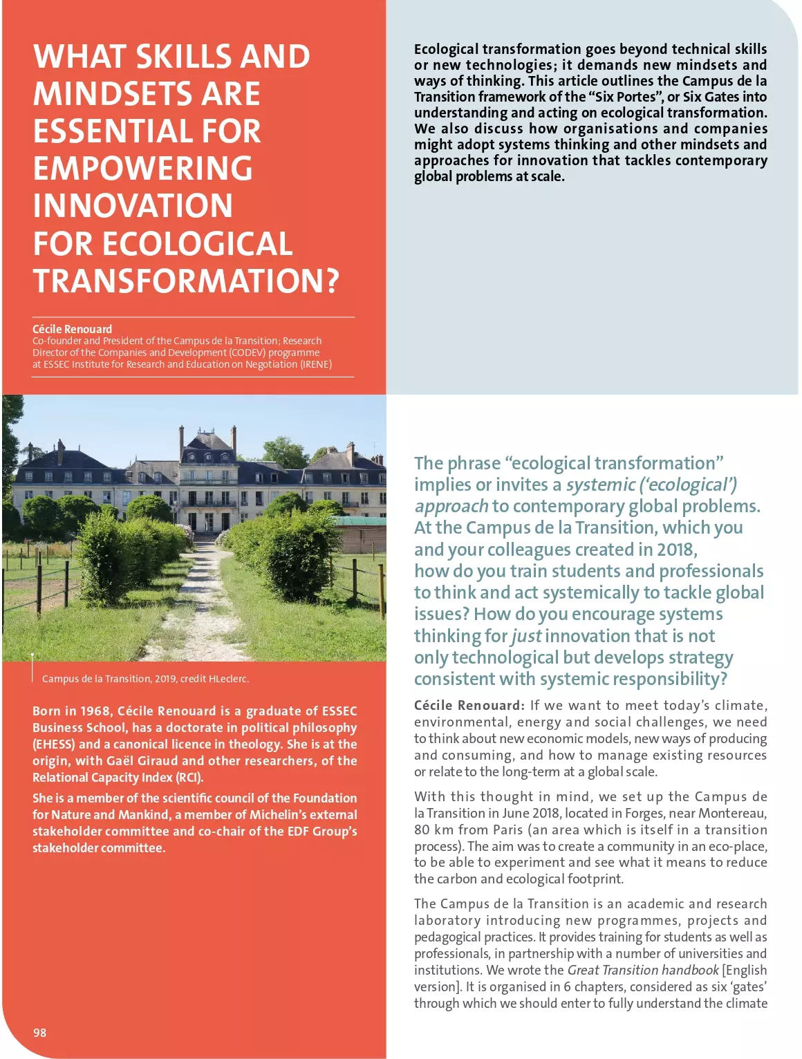 Ecological transformation goes beyond technical skills or new technologies; it demands new mindsets and ways of thinking. This article outlines the Campus de la Transition framework of the “Six Portes”, or Six Gates into understanding and acting on ecological transformation. We also discuss how organisations and companies might adopt systems thinking and other mindsets and approaches for innovation that tackles contemporary global problems at scale.