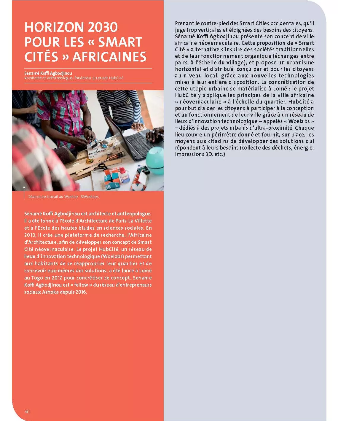 Prenant le contre-pied des Smart Cities occidentales, qu’il juge trop verticales et éloignées des besoins des citoyens, Sénamé Koffi Agbodjinou présente son concept de ville africaine néovernaculaire. Cette proposition de « Smart Cité » alternative s’inspire des sociétés traditionnelles et de leur fonctionnement organique (échanges entre pairs, à l’échelle du village), et propose un urbanisme horizontal et distribué, conçu par et pour les citoyens au niveau local, grâce aux nouvelles technologies mises à leur entière disposition.