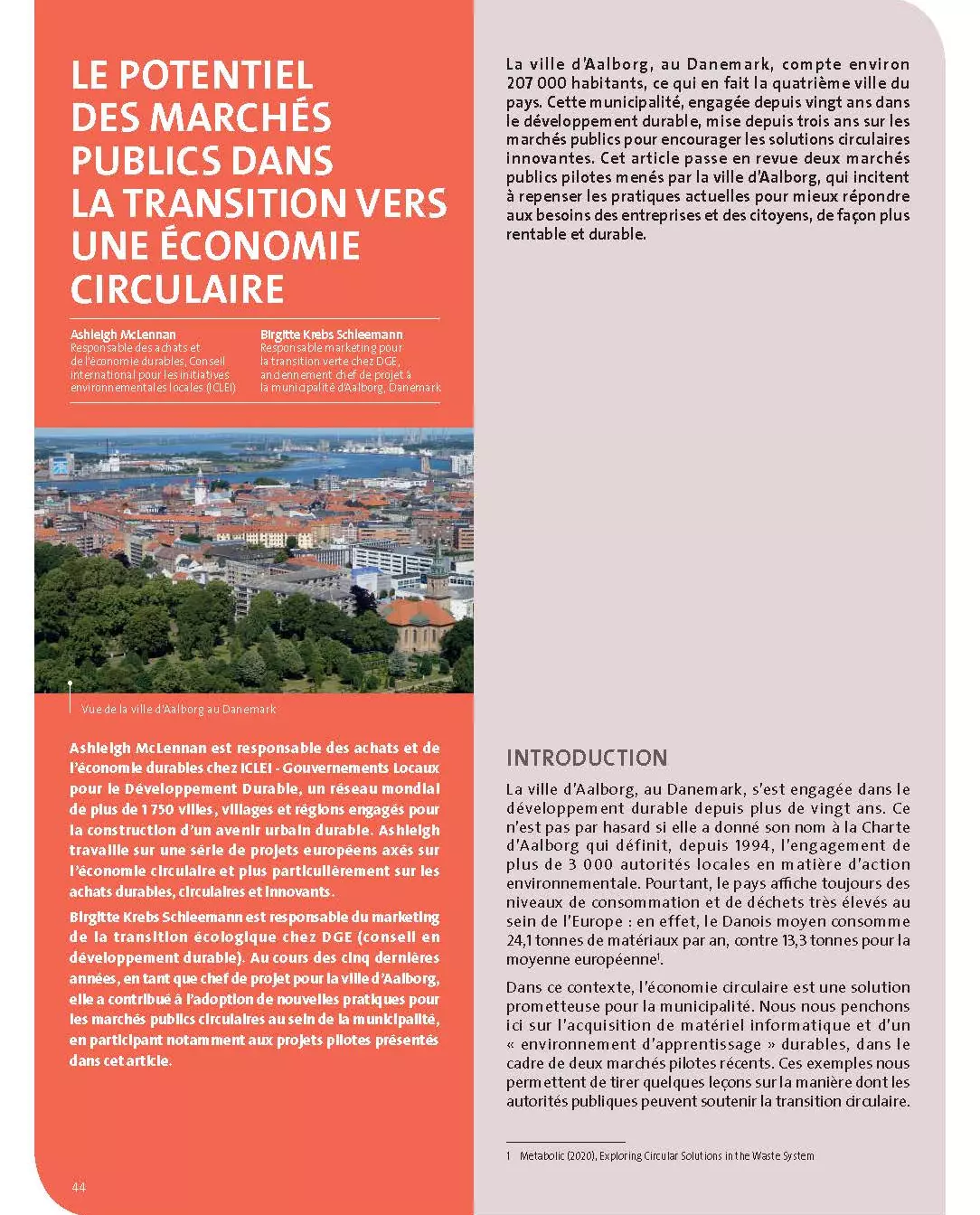 La ville d’Aalborg, au Danemark, compte environ 207 000 habitants, ce qui en fait la quatrième ville du pays. Cette municipalité, engagée depuis vingt ans dans le développement durable, mise depuis trois ans sur les marchés publics pour encourager les solutions circulaires innovantes. Cet article passe en revue deux marchés publics pilotes menés par la ville d’Aalborg, qui incitent à repenser les pratiques actuelles pour mieux répondre aux besoins des entreprises et des citoyens, de façon plus rentable et durable.