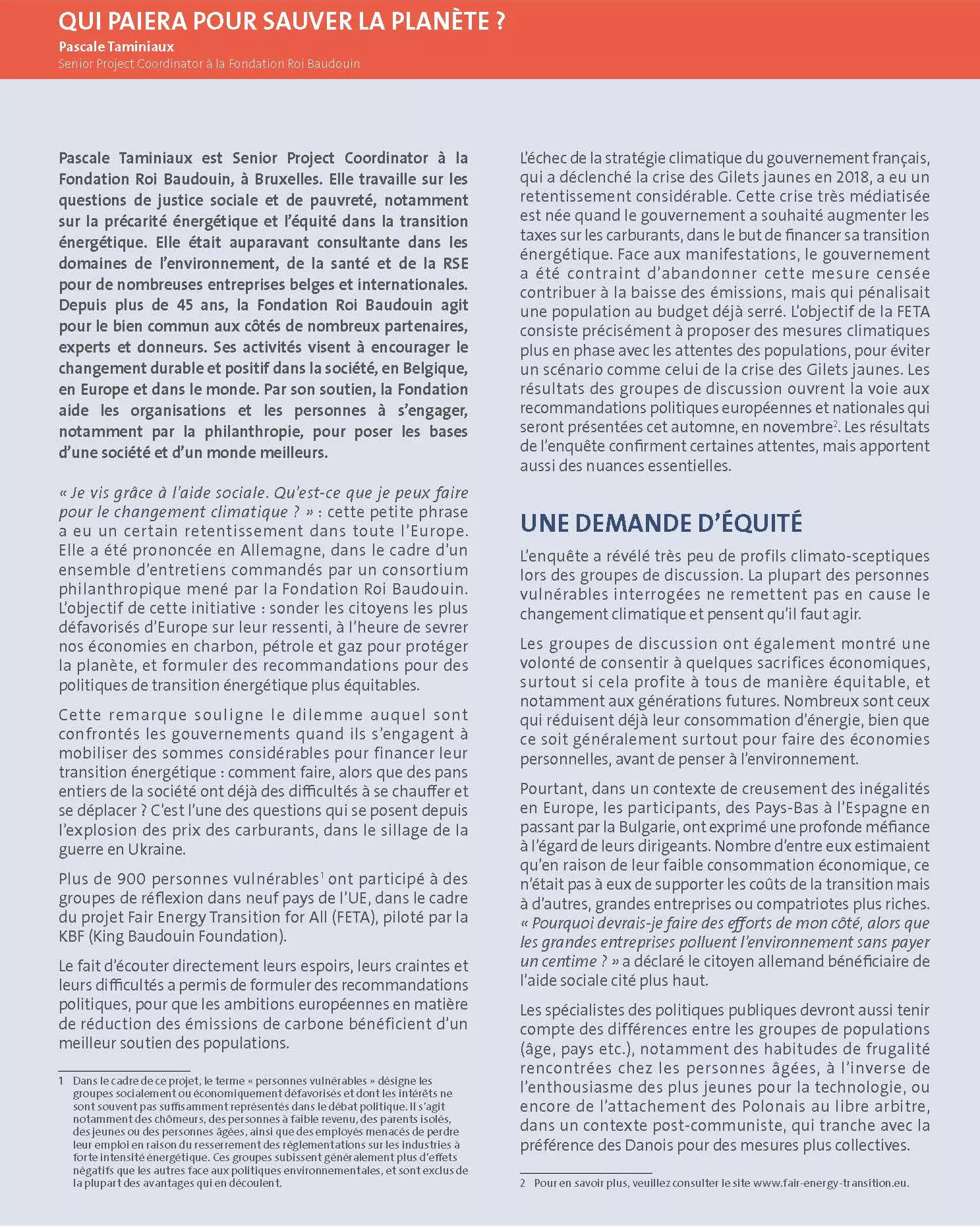 « Je vis grâce à l’aide sociale. Qu’est-ce que je peux faire pour le changement climatique ? » : cette petite phrase a eu un certain retentissement dans toute l’Europe. Elle a été prononcée en Allemagne, dans le cadre d’un ensemble d’entretiens commandés par un consortium philanthropique mené par la Fondation Roi Baudouin. L’objectif de cette initiative : sonder les citoyens les plus défavorisés d’Europe sur leur ressenti, à l’heure de sevrer nos économies en charbon, pétrole et gaz pour protéger la planète, et formuler des recommandations pour des politiques de transition énergétique plus équitables.