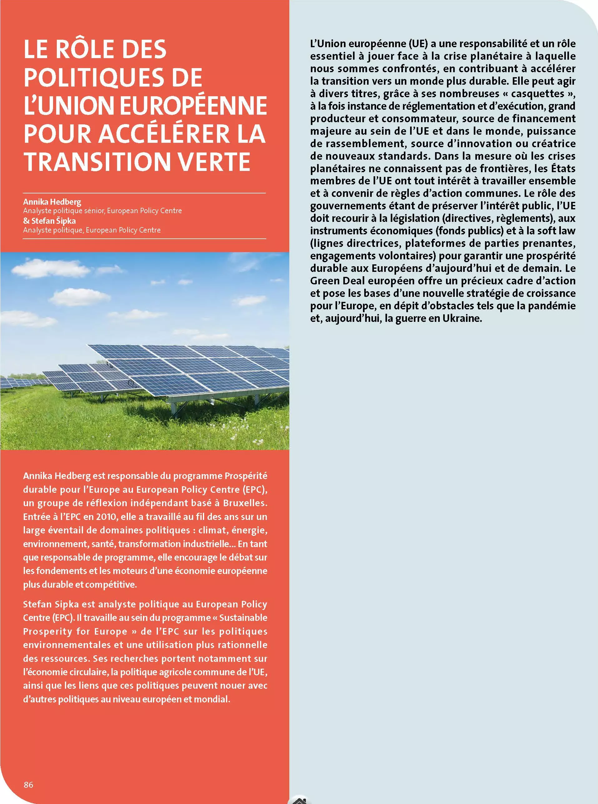 Le rôle des gouvernements étant de préserver l’intérêt public, l’UE doit recourir à la législation (directives, règlements), aux instruments économiques (fonds publics) et à la soft law (lignes directrices, plateformes de parties prenantes, engagements volontaires) pour garantir une prospérité durable aux Européens d’aujourd’hui et de demain. Le Green Deal européen offre un précieux cadre d’action et pose les bases d’une nouvelle stratégie de croissance pour l’Europe, en dépit d’obstacles tels que la pandémie et, aujourd’hui, la guerre en Ukraine.